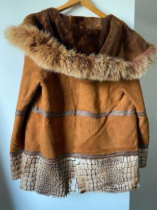 Abrigo de piel natural con un diseño único y detalles llamativos. - Capucha con borde de pelo. - Forro interior de piel. - Detalles de piel con estampado de escamas en los bajos. - Cierre con botones de madera y metal.