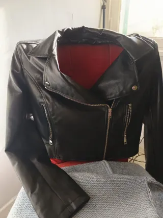 Cazadora de piel sintética en color negro. Diseño moderno y versátil. - Cuello redondo. - Cierre de cremallera frontal. - Corte entallado. - Usada 1 vez.