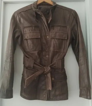 Elegante cazadora de piel en un bonito tono marrón chocolate. Es una prenda nueva, lista para estrenar. - Diseño clásico con cinturón. - Cierre de botones. - Cuello solapa.