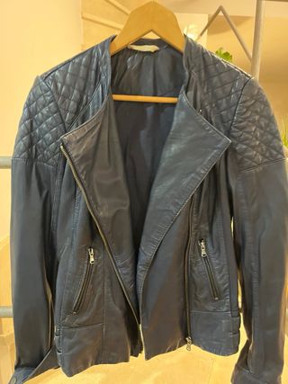 Cazadora de piel estilo vintage en un bonito tono azul marino. Un clásico que nunca pasa de moda. - Diseño acolchado en los hombros. - Cierre asimétrico con cremallera. - Bolsillos frontales con cremallera.