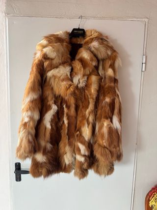 Elegante abrigo de zorro rojo con un diseño clásico. - Piel de zorro sintetica. - Tonos beige y marrones naturales. - Cuello amplio y envolvente Nose que marca es