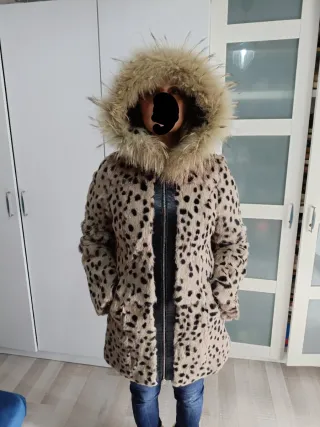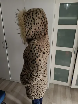 Abrigo de piel de conejo con un diseño llamativo y capucha. - Detalle de pelo de zorro en la capucha y cuero negro en cremallera - Estampado de leopardo y forrada de raso negro. Muy buen estado, comprado peletería en Santander