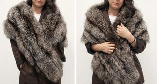 Elegante abrigo de piel de zorro. - Piel de zorro auténtica. - Diseño abierto sin cierres. - Tonos marrones y plateados.