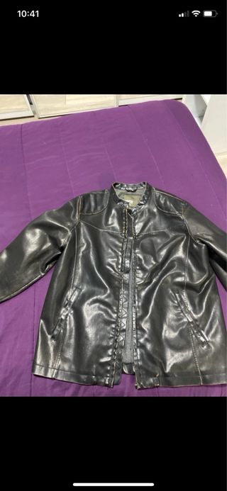 Cazadora de efecto piel con un diseño moderno y atemporal. - Cierre de cremallera. - Bolsillos con cremallera. - Cinturón ajustable. Es una S grande más bien es una M,