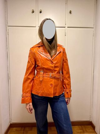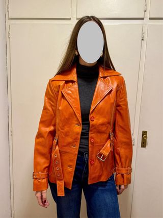Cazadora vintage SWL de piel de cabra en color naranja Talla 40 - Cuello solapa - Cierre de botones - Cinturón ajustable en cintura - Puños con trabillas - Bolsillos delanteros con detalle de trabillas
