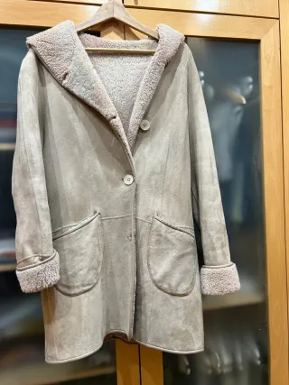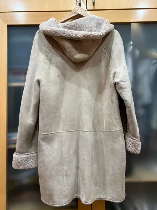 Abrigo de piel vuelta con un diseño elegante y cálido. - Capucha integrada. - Cierre con botones. - Bolsillos frontales. - Forro interior de borreguito.