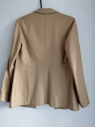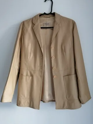 Elegante chaqueta de piel en tono beige. Talla 42 italiana - Diseño clásico con solapas. - Cierre de botones. - Bolsillos frontales.