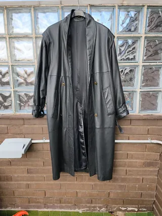Abrigo de piel sintética con un diseño moderno y elegante. Perfecto para añadir un toque de estilo a cualquier atuendo. - Material exterior: Piel sintética. - Diseño largo y holgado. Desperfecto en axila y forro que se puede coser perfectamente, de ahí su precio, por lo demás está perfecto abrigo elegante vintage retro años 50
