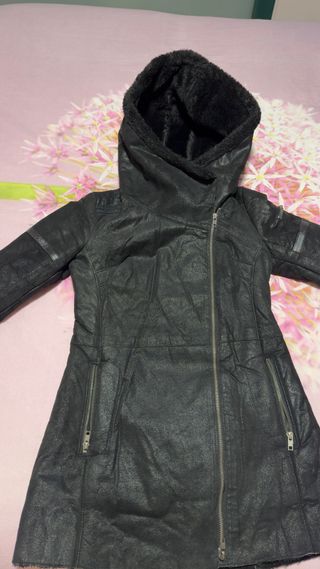 Abrigo de piel auténtica Isaco talla S. Exterior de cuero negro, interior forrado con pelito suave 100% poliéster muy calentito, incluida la capucha. Cremallera asimétrica, bolsillos con cremallera y corte entallado