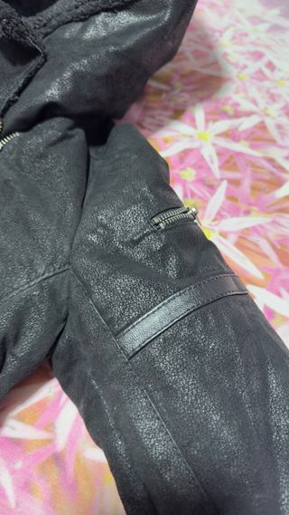 Cazadora estilo biker con efecto piel y detalles en blanco. - Cuello y puños con forro de borreguito. - Bolsillos delanteros con solapa. - Cierre de cremallera. Medidas en última foto