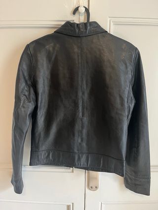 Chaqueta de piel / cuero con un diseño moderno y detalles acolchados en los hombros. - Cierre de cremallera frontal. - Bolsillos con cremallera. - Cuello redondo. En buen estado