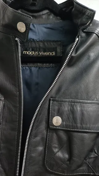 Chaqueta estilo aviador de cuero. - Cuello clásico. - Cierre de botones. - Dos bolsillos frontales con solapa. - Bolsillo adicional con cremallera en la manga. - Puños y cintura elásticos.
