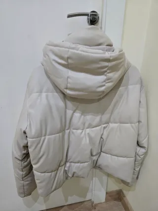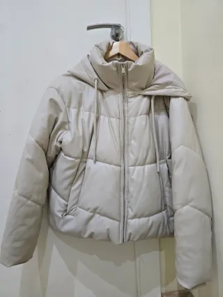Precioso abrigo acolchado de Zara en un diseño de tendencia. El tejido imita la piel sintética o efecto polipiel, dándole un acabado muy moderno. Es así un poco corta, con un cuello alto envolvente y capucha, mantien bien el calor por dentro. El color crudo/beige es muy combinable y elegante a la vez.