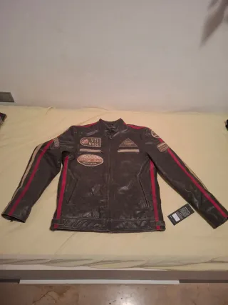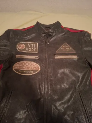 Chaqueta de estilo motero con detalles de rayas rojas y beige en las mangas y hombros. Presenta varios parches decorativos con motivos de carreras y texto. - Tallas disponibles: M y L. - Diseño con cuello alto y cierre de cremallera. - Acabado en piel sintética.