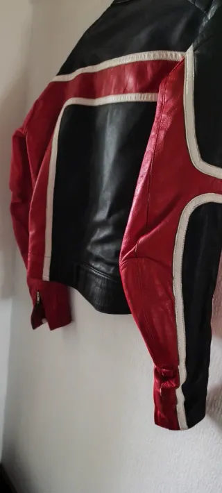 Cazadora de cuero para moto con un diseño llamativo. - Combinación de colores negro y rojo. - Detalles en blanco. - Cierre de cremallera frontal. - Bolsillo con cremallera en el pecho.