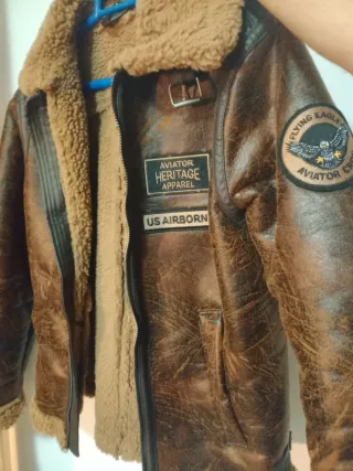 Chaqueta de piel estilo aviador con forro de borrego. - Diseño desgastado y auténtico. - Parche Flying Eagle Aviator Crew en manga. - Parche Aviator Heritage Apparel US AIRBORNE en pecho. - Cuello de borrego. - Cremallera frontal.