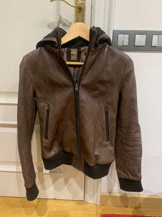 Cazadora de piel en color marrón, como nueva, solo puesta dos veces. - Cierre asimétrico con cremallera. - Dos bolsillos frontales con cremallera. - Detalle acolchado en los hombros. - Cuello solapa.