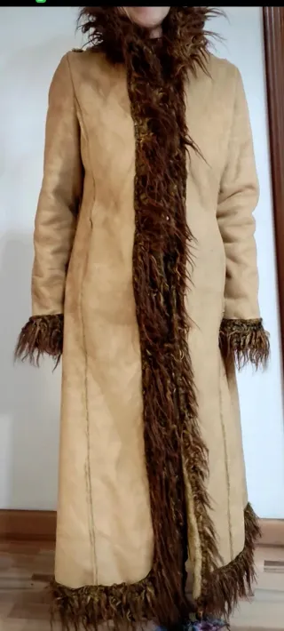 Abrigo color camel talla 44. Es muy gustoso y esta en perfecto estado. Realmente parece de piel vuelta.