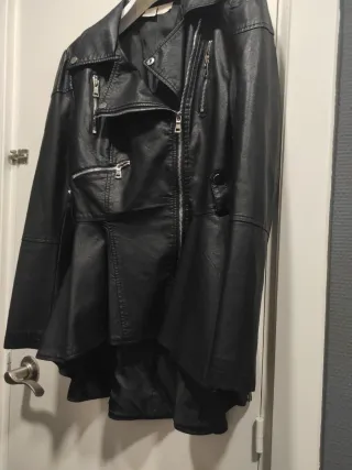Chaqueta de estilo motero confeccionada en polipiel. - Diseño asimétrico con cremalleras. - Cuello solapa. - Bajo con volante. - Puños con cremallera.