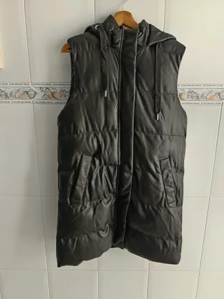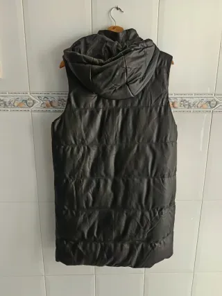 Chaleco largo con capucha y efecto piel. - Diseño acolchado. - Cierre central de cremallera con botones a presión. - Cordones ajustables en la capucha. - Bolsillos laterales. - Corte recto.