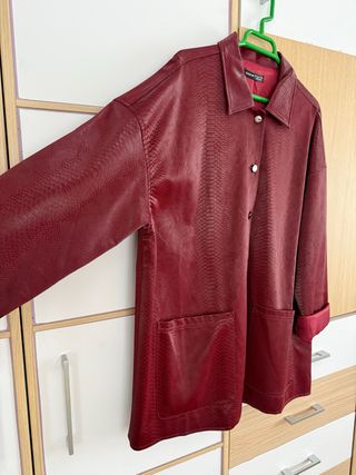Chaqueta de imitación cuero en color rojo. - Diseño moderno y versátil. - Acabado liso y brillante. - Cierre de cremallera frontal. - Cuello solapa clásico.