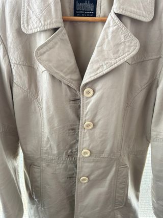 Cazadora de piel con un diseño clásico y versátil. - Material: Piel auténtica. - Color: Tonos beige y marrón. - Cierre de cremallera y botones. - Bolsillos frontales con solapa. - Puños ajustables.