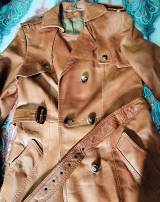 Piel auténtica. Abriga un montón, he estado con este abrigo a bajo 0 y no lo he sentido. Comodísimo y de corte clásico, además es largo. Cintura máxima al cerrar el boton: 88cm Hombros: 41cm Largo: 123cm Sisa:46cm Aprox una talla M. - Doble botonadura. - Cinturón a juego. - Bolsillos frontales. El abrigo no es nuevo, tiene ciertos signos de que es antiguo: arrugas por la parte trasera y zonas de decoloración - en unas partes parece un tono más oscuro, en otras más claro (aunque puede parecer un efecto buscado). De ahí el precio está tan rebajado. Estos defectos tienen fácil arreglo en tintorería, se puede dejar como nuevo.