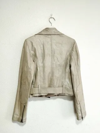 Chaqueta Stradivarius simil cuero o cuero ecológico color arena e interior en simil piel. Talla M Con cinturón y cremalleras Excelente estado de conservación, casi sin uso.