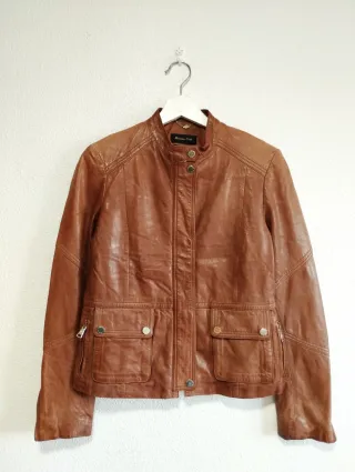 Elegante chaqueta de piel de Massimo Dutti. - Diseño clásico y atemporal. - Cierre de cremallera y botones. - Bolsillos frontales con solapa y botón. - Puños con cremallera.