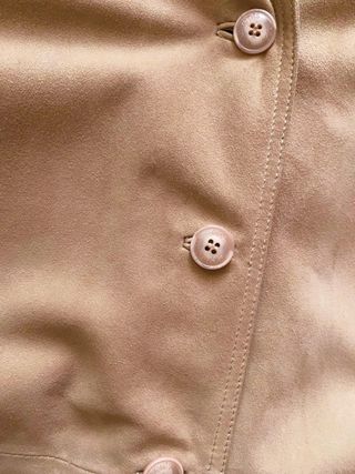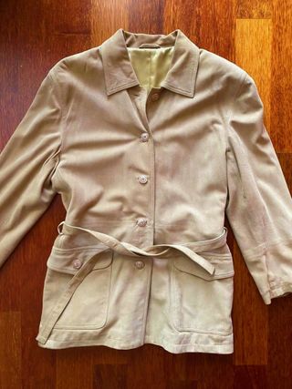 Chaquetón de piel de ante serraje estilo trench corta, comprado en una tienda local de piel, marca Elements. Talla L de mujer. Color beige. Buen estado. Costó 300€, Está forrada, viene con bolsillos, cinturón y botones frontales. Medidas aproximadas: 50 cm de hombro a hombro, 60 cm de axila a axila y de largo 70 cm. Pone en la etiqueta que es una talla XXL pero es una L (40 española). #trench #chaquetón #gabardina #vintage #suede