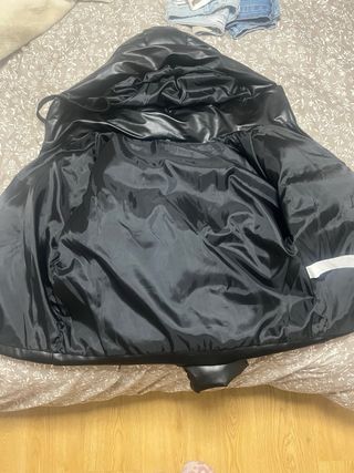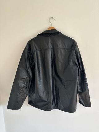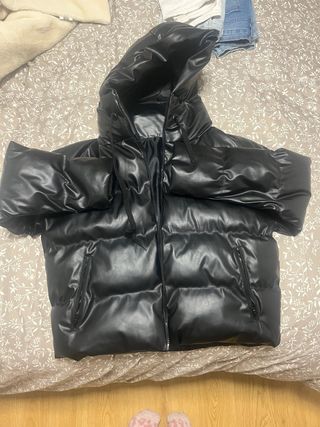 Cazadora de efecto piel con un diseño acolchado. - Cierre de cremallera. - Bolsillos frontales con botón. - Puños elásticos. - Tiene alguna peladura del uso pero al llevarla puesta no se ve porque es en la parte interior del cuello. NO RESERVO