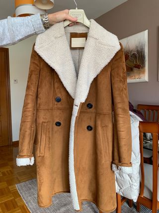 Abrigo de piel vuelta marrón, largo. Buen estado, tiene dos piques que se aprecian en la fotografías. Super calentito!