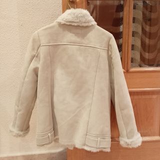 Chaquetón de estilo aviador con interior de borreguito. - Cierre de botones. - Bolsillos frontales. - Cuello y puño forrados. - Piel de imitacion Talla bastante grande. Medidas De sisa a sisa 70, hombros 60, largo 65 cm
