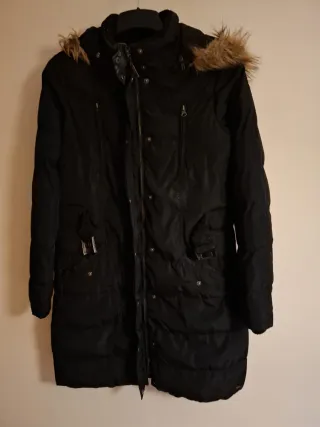 Abrigo de plumas negro, perfecto para el frío. - Capucha con detalle de pelo. - Cierre de cremallera y botones. - Bolsillos frontales con cremallera y solapa. - Hebillas decorativas en los bolsillos. El broche del cinturon no cierra, adjunto foto.
