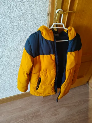 Abrigo plumas ( polar )con capucha, perfecto para el frío. - Diseño bicolor en azul marino y amarillo. - Capucha forrada de tejido polar azul. Talla 140 cm ( 9/10 años aprox )