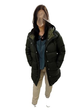 Abrigo plumas con capucha, queda a la altura de la cintura.