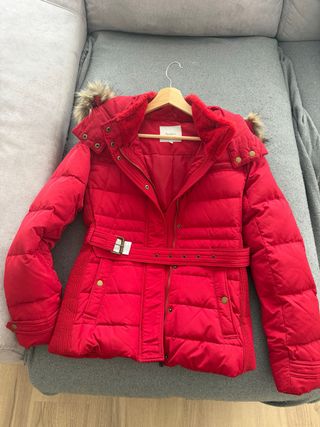 Abrigo corto de plumas de la marca Zara. Diseño acolchado con cinturón. - Cuello con pelo sintético. - Cierre de cremallera y botones. - Bolsillos laterales con cremallera. - Detalle de ribete en contraste. - Relleno Pluma y plumón 100% natural - Da poca talla, realmente queda como una M