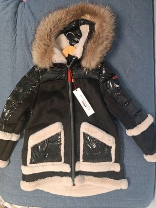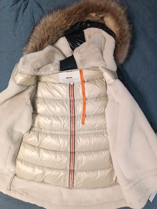 Plumifero color naranja tornasolado, precioso. Sin usar. Su precio original 369 euros. Es mezcla de poliester, plumón y pluma. Muy ligero. Tiene capucha dentro drl cuello. Es talla S pero muy amplio.