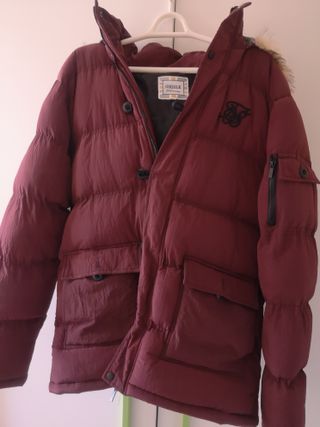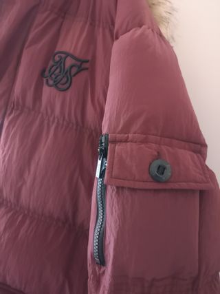 Abrigo largo de la marca SikSilk en color granate. XL SikSilk largo 3/4 Granate con reflejo Plumas Como Nuevo!! Prácticamente sin uso. Se vende por cambio de talla. MÁS TALLAS Y COSAS EN MI PERFIL! - Diseño acolchado. - Capucha con pelo. - Bolsillos frontales con solapa. - Cierre de cremallera y botones. - Logo bordado en el pecho.