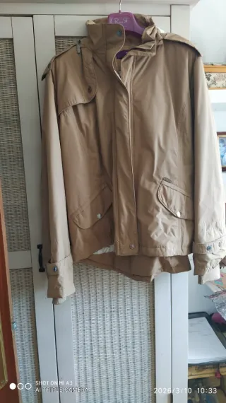 Chaqueta señora color beige oscuro, con bolsillos y botones. Talla grande. Le falta el cinturón, por lo demás está en buen estado.