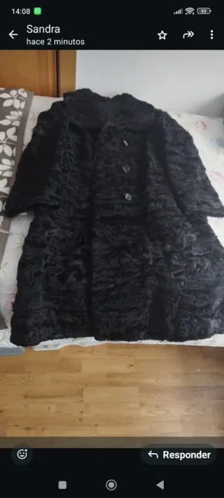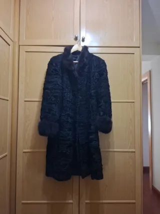 Elegante abrigo de estracan autentico en color negro. Ideal para ocasiones especiales o para añadir un toque de sofisticación a tu vestuario. Tiene un estimado va abriendo en la parte de abajo - Diseño talla 48 / 50 - Cuello y puños con detalle de vison - Cierre frontal.