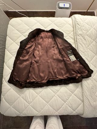 Elegante chaqueta corta de pelo sintético en tono marrón oscuro. Un diseño clásico que aporta sofisticación a cualquier atuendo. Talla m que cruzando más o menos puede ser S o L la parte de atrás es fruncida en la ultima foto se ve el interior que es tela gran calidad parece auténtico comprado en peletería y costó muy caro
