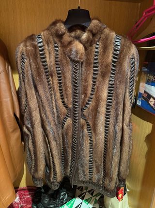 Elegante chaquetón de piel, estilo visón. Una prenda clásica y sofisticada. Las medidas son 58 cm. entre sisas y 82 cm de largo, ancho de pecho 58, largo de manga 57. Tiene bolsillos laterales frontal. El forro interior está bordado y tiene bolsillo interior.