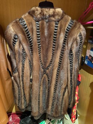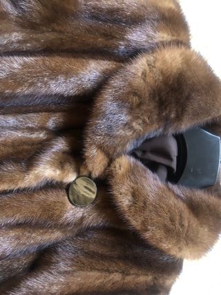 Abrigo tipo visón de segunda mano. - Talla 44/46. - Cierre con botón joya. El forro estaba muy de dorado y se lo hemos cambiado por un forro estampado como se ve en la foto