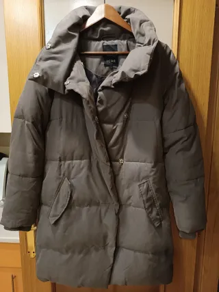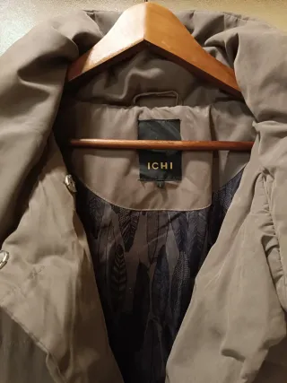 Abrigo largo de la marca ICHI, en un bonito color visón. Su diseño es elegante y moderno, perfecto para mantenerte abrigada con estilo. - Forro interior con estampado de plumas. - Cierre con botones a presión.