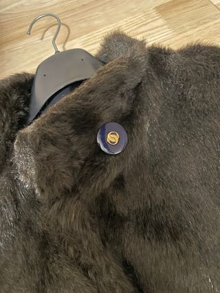 Abrigo con un elegante efecto visón. Su diseño combina tonos marrones y azules, con un detalle de botón distintivo. Características: • Material: Sintético efecto visón • Color: Marrón oscuro / chocolate • Largo: Por debajo de la cadera • Con bolsillos delanteros • Forro interior en perfecto estado
