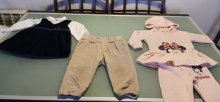 Lote de ropita bebé invierno 12 meses. Conjunto compuesto por vestidito azul marino de terciopelo con lacito y blusa color beige. Pantalón color vison de pana, con lacitos, forrado. Conjunto rosa de Mininie, compuesto por pantalón de algodón y camisola o vestido, muy abrigado para el invierno. SI QUIERES HACER ALGÚN CAMBIO CON OTRO LOTE, O COMPRAR UNA SOLA PRENDA, NINGÚN PROBLEMA, ESCRÍBEME.