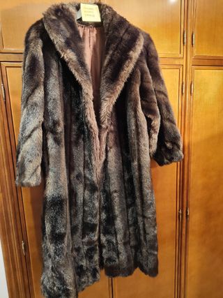 Abrigo de visón sintetico hecho en Francia por Michel Alexis Paris. Tiene una etiqueta en los bolsillos de fuera que pone 40 pero si es referente a la talla creo que sería alguna más fabrique en France 63% acrylique 37% coton.