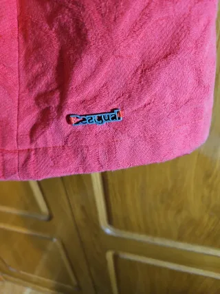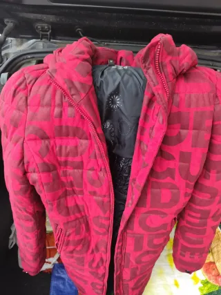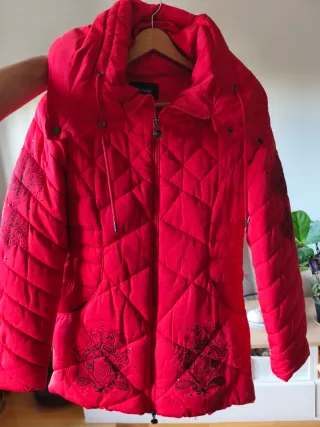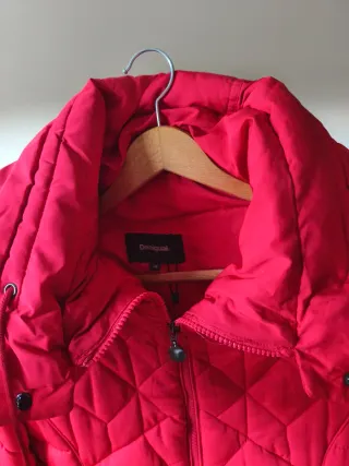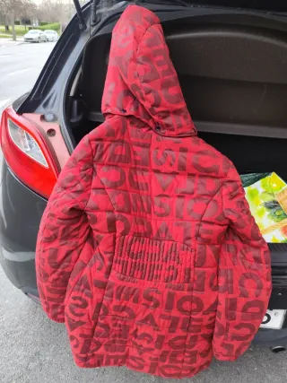 Abrigo acolchado Desigual, talla 36, color rojo discreto (no brillante) con letras. Sólo se ha usado dos veces, esta nuevo. Capucha desmontable con botones automáticos, cremallera doble, puños ajustables con 2 botones automáticos para ajustar más o menos el puño. Fruncido en el centro de la espalda que estiliza la figura. Caliente y muy cómodo. Por dentro va con forro estampado y dos tiras para poderlo llevar colgado al hombro si te lo quitas y no tener que llevarlo en la mano.