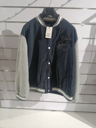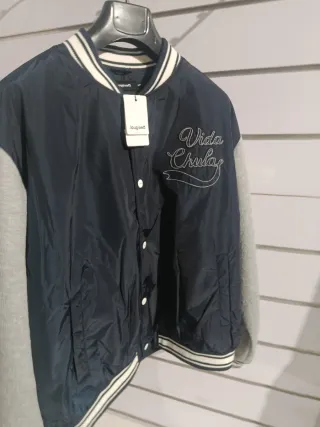Chaqueta estilo bomber Varsity de la marca Desigual. - Cuerpo principal en color azul. - Mangas en color gris jaspeado. - Cuello, puños y bajo con detalles de rayas blancas y azules. - Cierre de botones a presión en la parte delantera. - Bordado Vida Chula en el pecho.